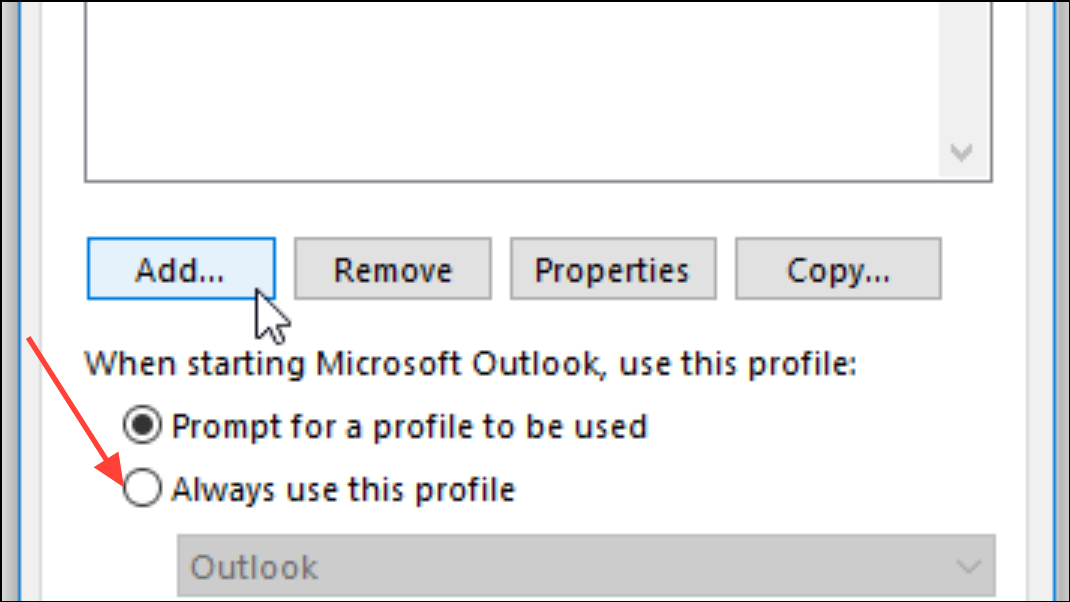 Step 2: Click Add, enter a name for the new profile, and follow the prompts to add your email account. This process creates a fresh configuration, bypassing potential corruption in the old profile.