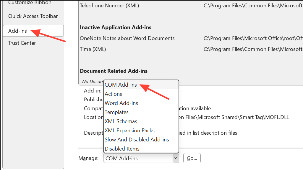 Step 2: If Outlook opens, go to File > Options > Add-ins. At the bottom, set “Manage” to COM Add-ins and click Go. Uncheck all add-ins and restart Outlook normally. Re-enable add-ins one by one to find the culprit.