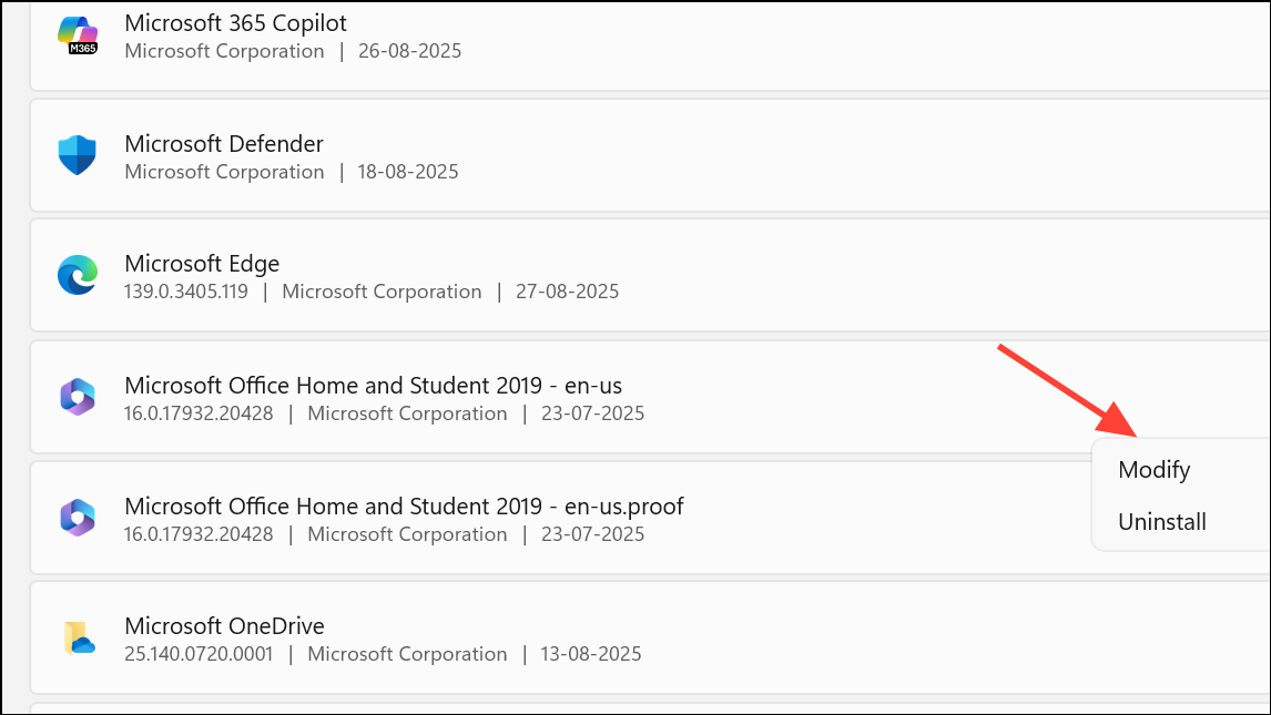 Step 2: Locate Microsoft Office in the list. Click it, then select Modify or Change.