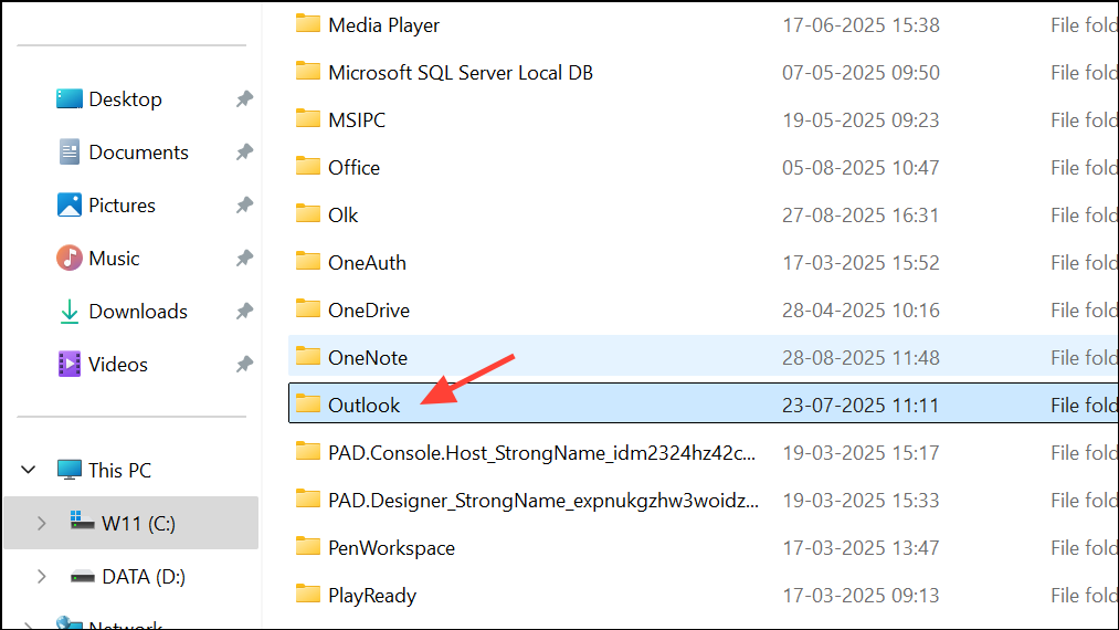 Step 2: Navigate to C:\Users\[YourUser]\AppData\Local\Microsoft\Outlook. If you don’t see AppData, enable “Show hidden files” in File Explorer.