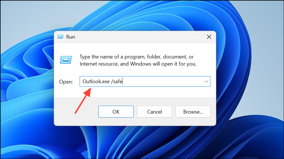 Step 1: Press Windows + R, type Outlook.exe /safe, and press Enter.