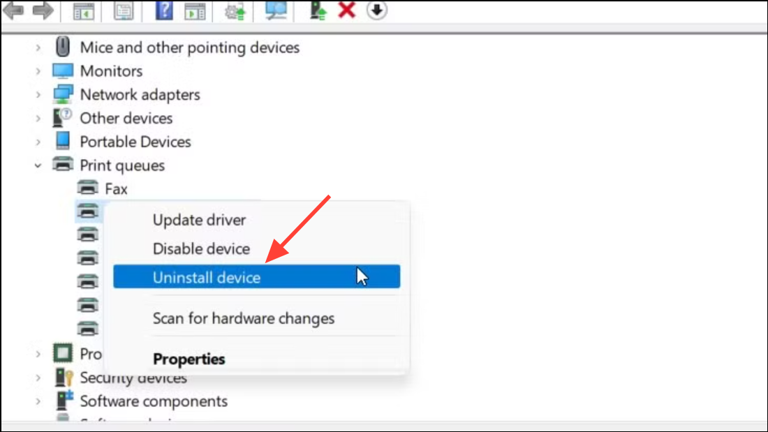 Step 2: Expand the Printers section, right-click your printer, and select Uninstall device. Confirm removal if prompted.