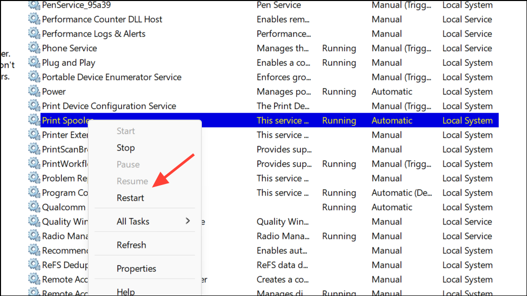 Step 2: Locate Print Spooler in the list, right-click it, and select Restart. This clears stuck print jobs and resets the print subsystem.