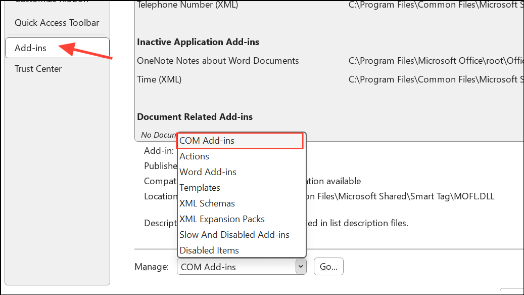 Step 3: To identify the culprit, go to File > Options > Add-ins. Click Go next to COM Add-ins.