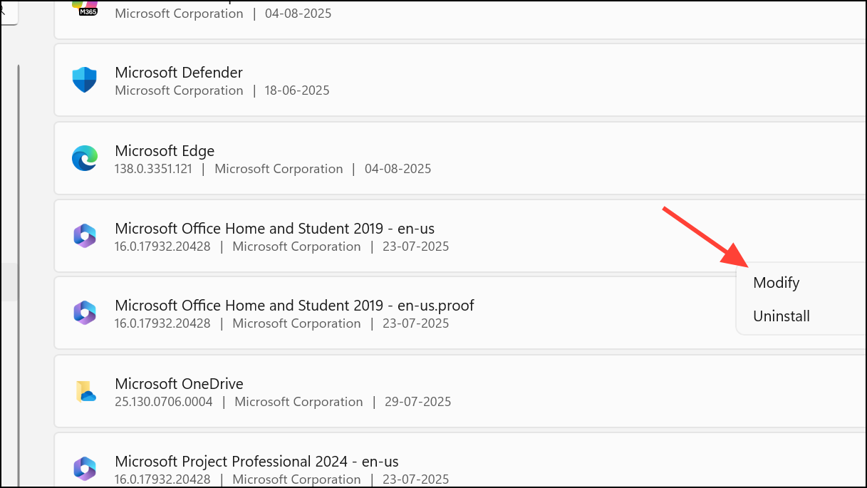 Step 2: Find Microsoft Office in the list. Click the three dots or select Modify.