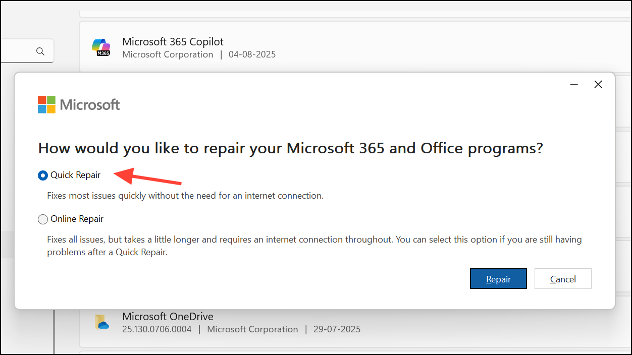 Step 3: Choose Quick Repair to fix minor issues without internet access. If issues persist, repeat and select Online Repair for a more thorough reset. This process repairs corrupted Office files that may be causing Outlook to malfunction during printing.