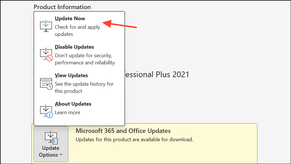 Step 2: Update Office if a newer build is available. In File > Office Account, click Update Options > Update Now. Allow the update to complete, then restart Outlook and test sending an email.