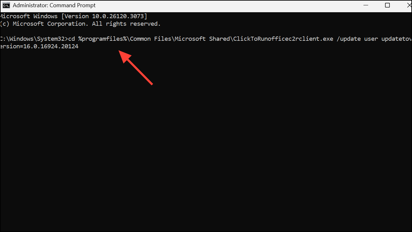 Step 3: If updating does not resolve the crash, roll back Office to a known stable version. Open Command Prompt as administrator and enter: