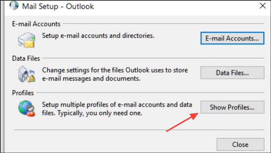 Step 2: Open the Control Panel and select Mail > Show Profiles. Highlight your profile and click Properties.