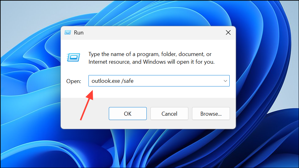 Step 1: Press Windows + R, type outlook.exe /safe, and press Enter.