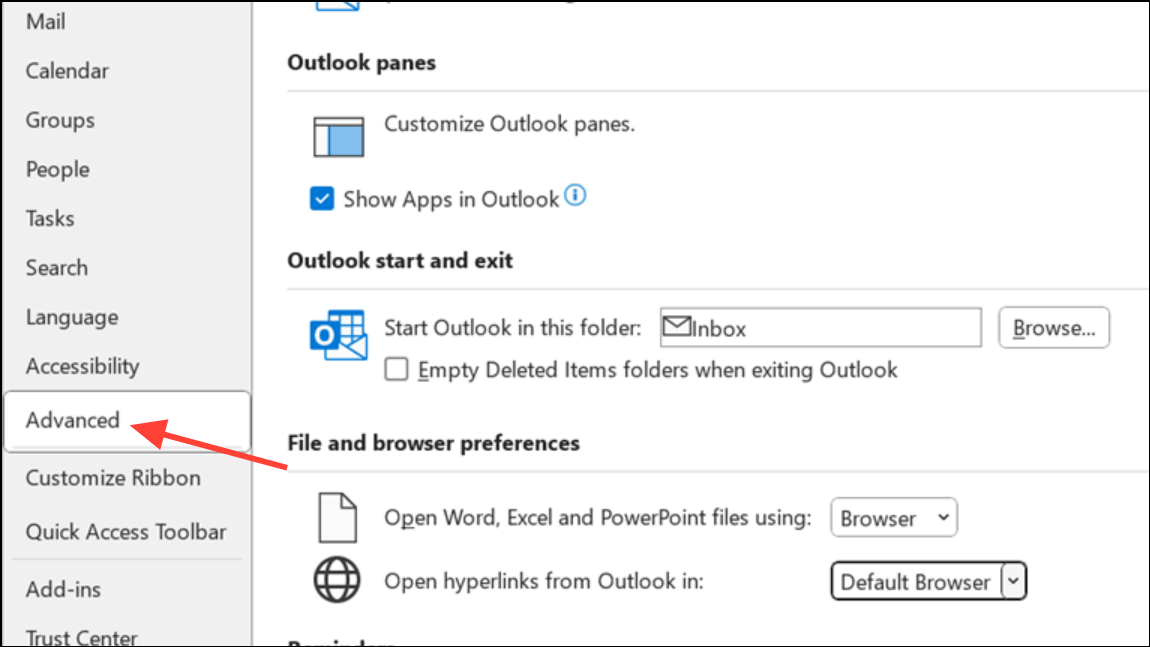 Step 2: In the Options window, click Advanced in the left sidebar. Scroll down to the “Send and receive” section.