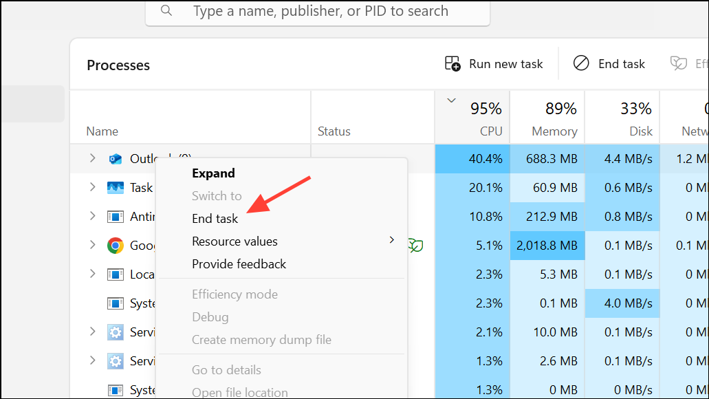 Step 1: Occasionally, Outlook or Windows processes hang and block outgoing mail. Close Outlook, open Task Manager, and end any outlook.exe processes.