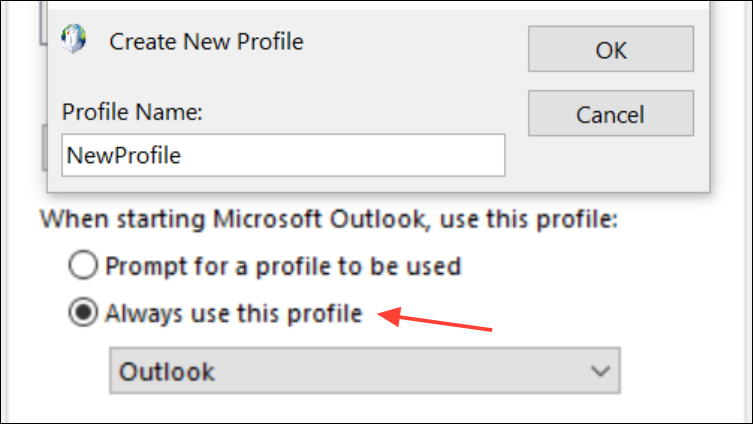 Step 2: Click Add to create a new profile, enter a name, and configure your email account. Set the new profile as default and restart Outlook.