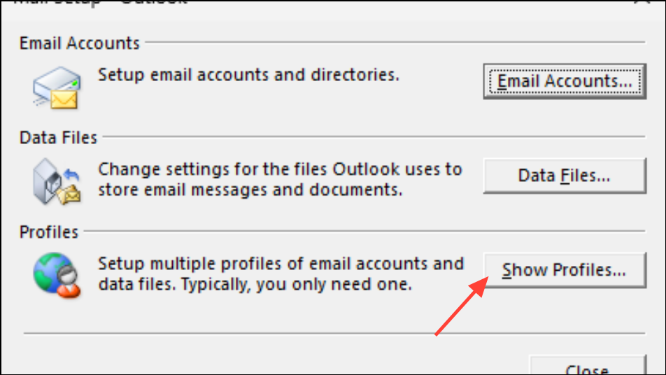 Step 1: If emails remain stuck despite correct settings, your Outlook profile may be corrupted. Open Control Panel and search for Mail, then select Show Profiles.