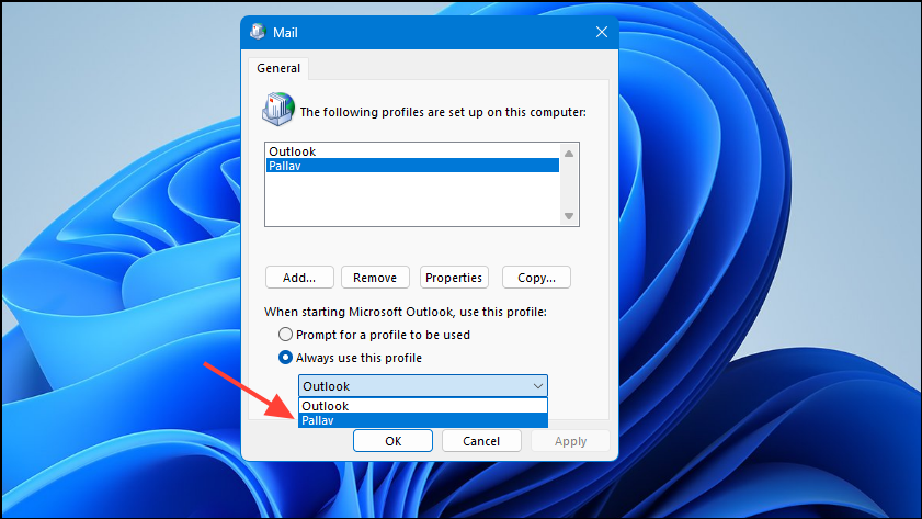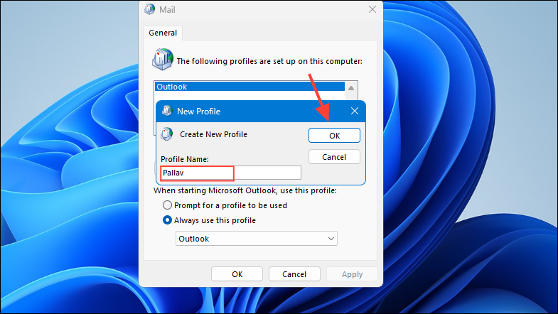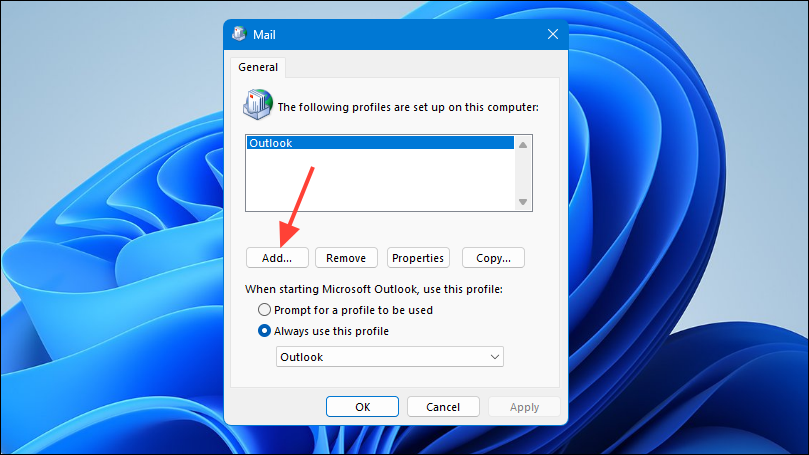 Step 8: After adding your account, return to the Mail window. Under When starting Microsoft Outlook, use this profile, select your new profile from the dropdown menu.
