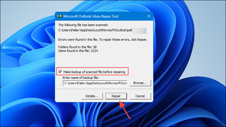 Step 7: If errors are found after the scan, ensure the option Make a backup of scanned file before repairing is checked, then click Repair.