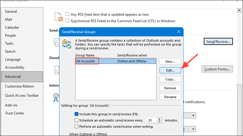 Step 4: In the Send/Receive Groups dialog, select All Accounts and click on Edit.