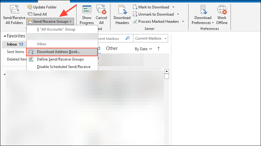 Step 2: Click on Send/Receive Groups, then select Download Address Book...