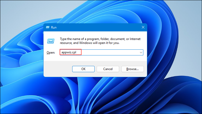 Step 2: Type appwiz.cpl and press Enter to open the Programs and Features window.