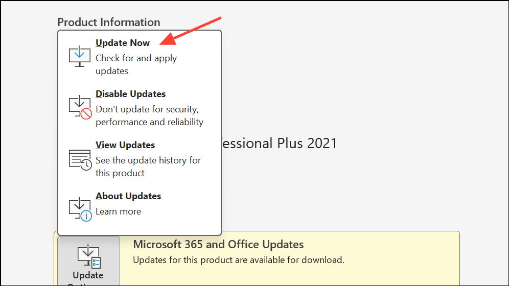 Step 1: Open Outlook and go to File > Office Account > Update Options > Update Now.