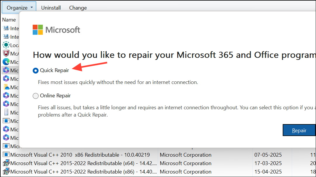 Step 4: Choose Quick Repair first. If problems persist, repeat the process and select Online Repair (note that Online Repair will require an internet connection and may take longer).