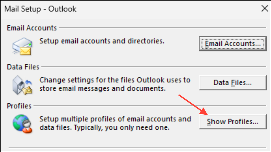 Step 2: Open the Windows Control Panel and select Mail, then click Show Profiles.