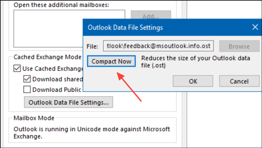 Step 2: Compact your data files to reclaim space. In Outlook, go to File > Account Settings > Data Files, select your data file, click Settings, and choose Compact Now.