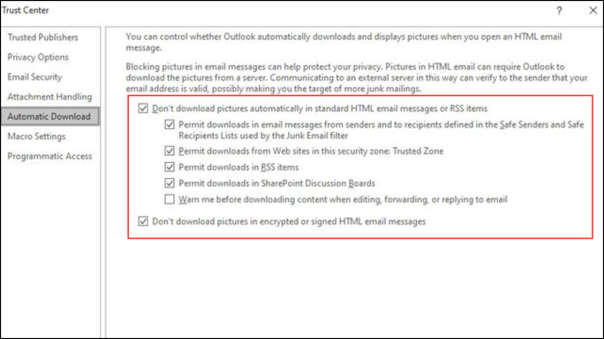 Step 1: Outlook may hang while loading external content, such as images in emails, especially on slow networks. To prevent this, go to File > Options > Trust Center > Automatic Download and select options to block automatic downloads of external content.