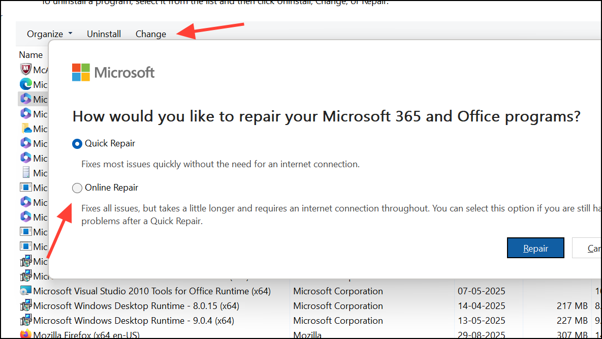 Step 1: Faulty Office installations can cause Outlook to freeze or crash. Close all Office apps, open Control Panel, go to Programs and Features, right-click Microsoft Office, and select Change(choose Online Repair for a thorough fix).