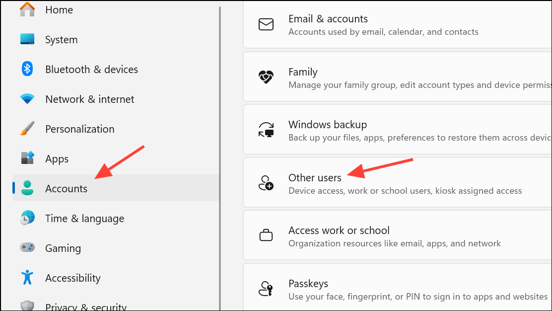 Step 3: If Outlook still freezes, your Windows user profile might be corrupted. Create a new Windows user account by opening the Settings app, going to Accounts, and selecting Other Users.