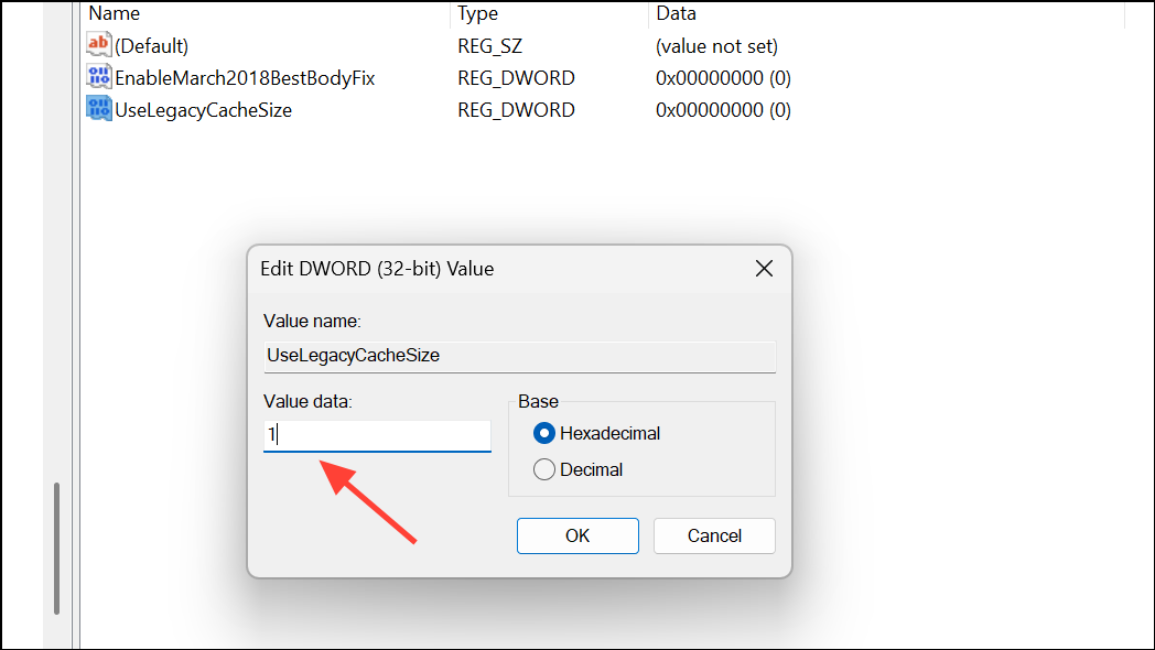 Step 4: Double-click UseLegacyCacheSize, set its value data to 1, and click OK. This instructs Outlook to use the legacy cache size, which can help prevent resource exhaustion when working with large data files.