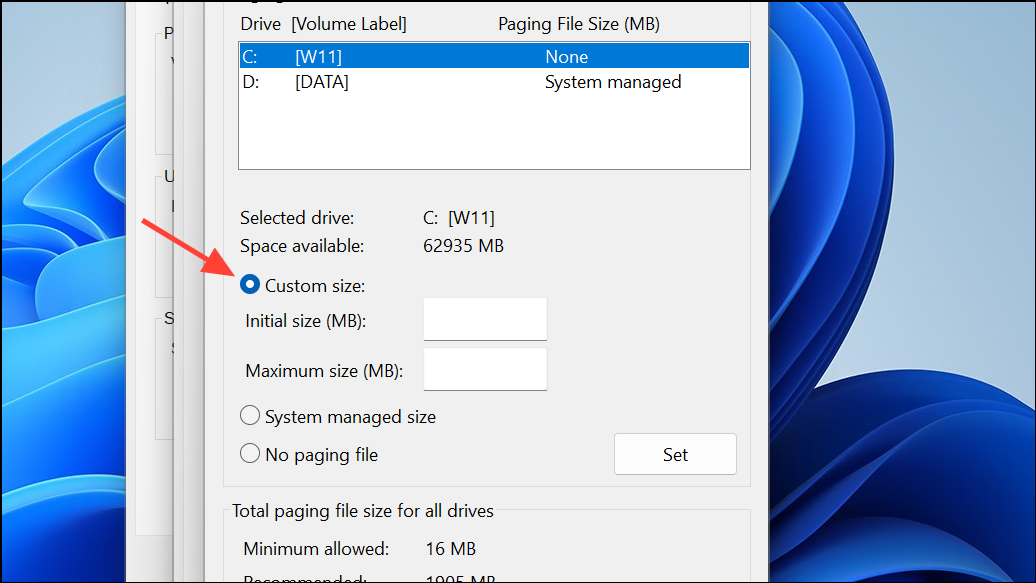 Step 3: Uncheck Automatically manage paging file size for all drives. Select your system drive, choose Custom size, and increase both the initial and maximum size values according to your system’s available storage and RAM (for example, set both to at least 4096 MB for 4GB, but higher for modern systems).