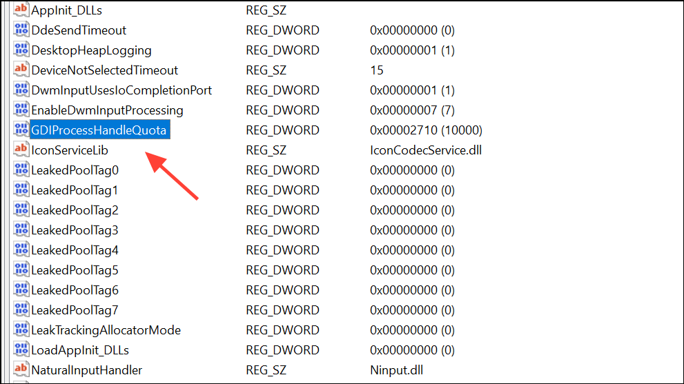 Step 2: Find the value GDIProcessHandleQuota. If it does not exist, right-click in the right pane, select New > DWORD (32-bit) Value, and name it GDIProcessHandleQuota.