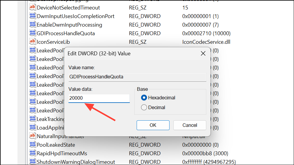 Step 3: Double-click GDIProcessHandleQuota and set the value to 20000 (decimal). This increases the number of GDI objects Windows allows per process, which can resolve memory errors in Outlook and other applications that frequently handle graphics or UI elements.