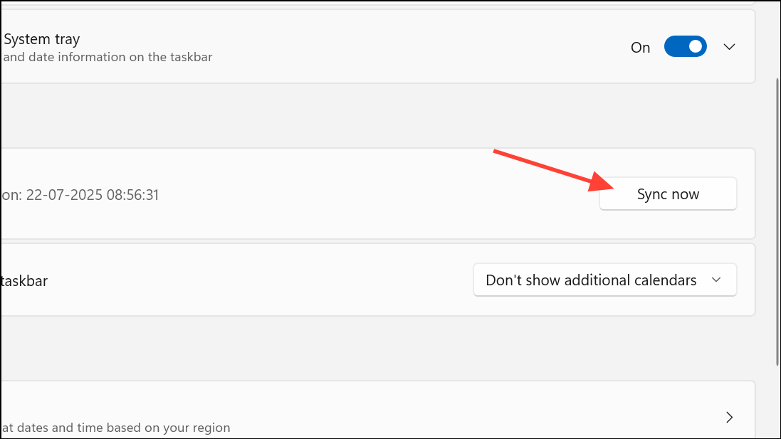 Step 2: Verify the displayed time and time zone. If anything is off, click Sync now under Additional settings.