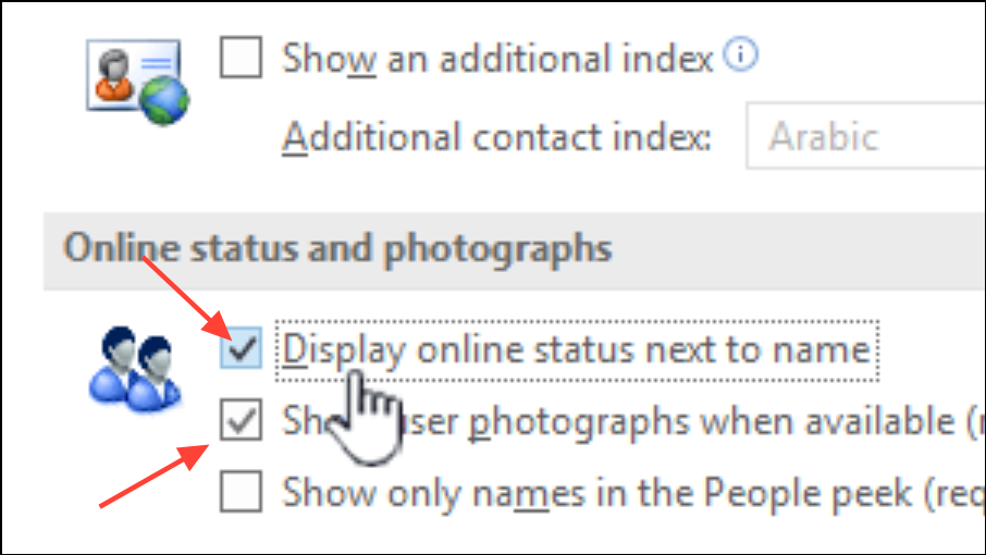 Step 5: In Outlook, go to File > Options > People, then uncheck Display online status next to name and Show user photographs when available. Click OK and restart Outlook.