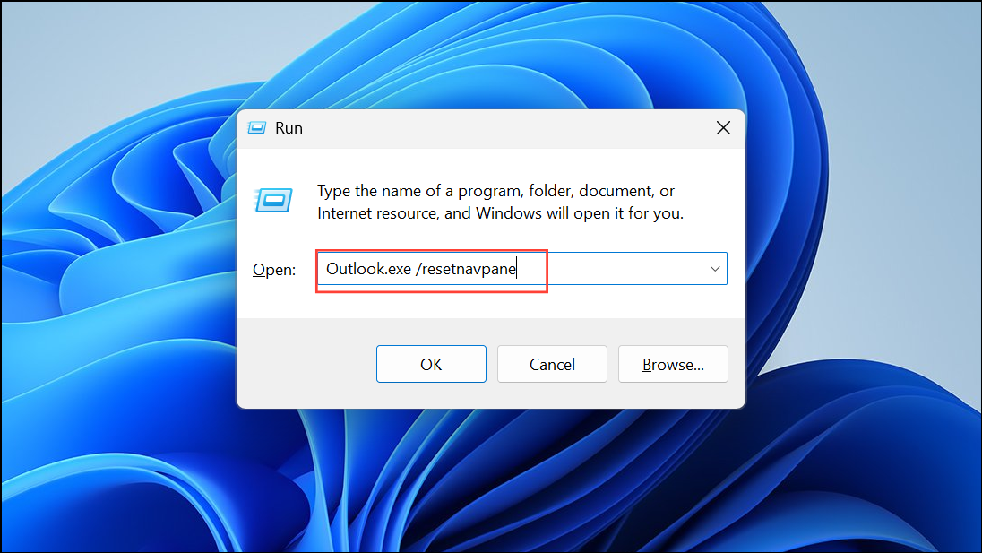 Step 2: Press Windows + R, type Outlook.exe /resetnavpane, and press Enter.