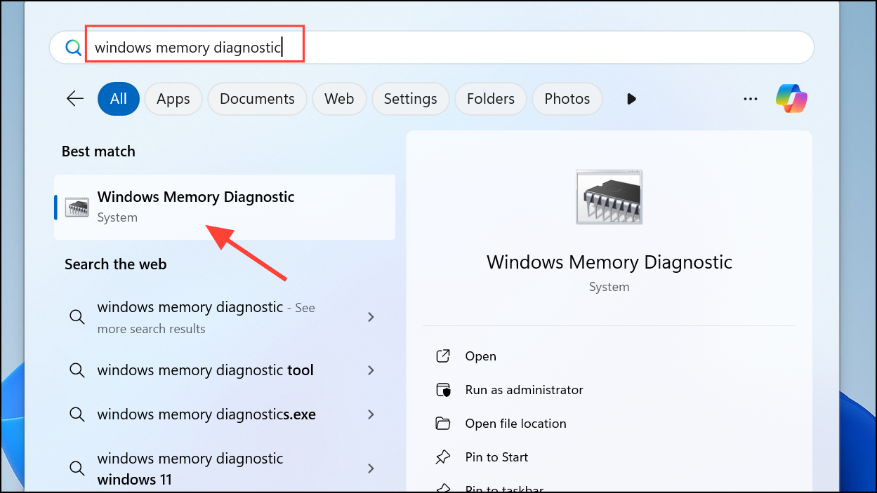 Step 1: Press Windows + S, type "Windows Memory Diagnostic," and open the tool.
