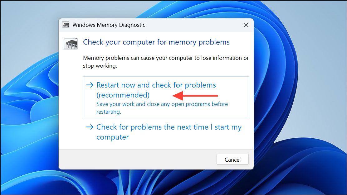Step 2: Select "Restart now and check for problems." Windows will reboot and run a thorough memory test.