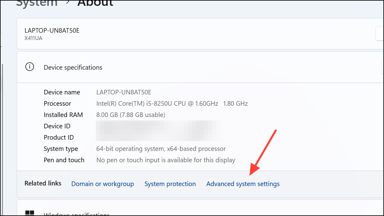Step 2: Click "Advanced system settings" under the Related links section.