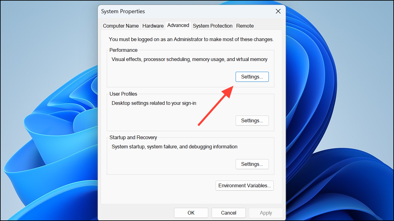 Step 3: In the System Properties window, click the "Settings" button under the Performance section.