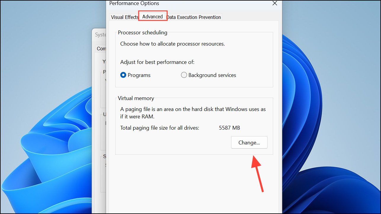 Step 4: Switch to the "Advanced" tab and click "Change" under the Virtual memory section.