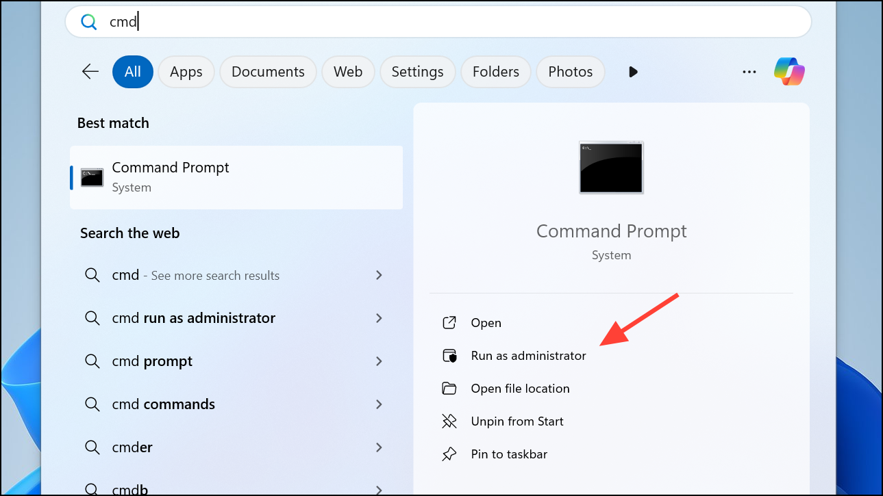 Step 1: Press Windows + S, type "Command Prompt," and open it as administrator.