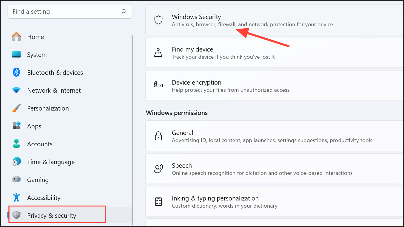 Step 1: Press Windows + I to open Settings, navigate to "Privacy & Security," and click "Windows Security."