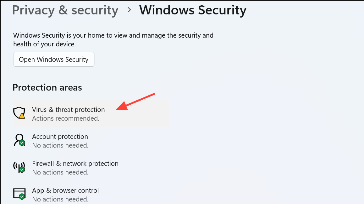 Step 2: Click "Open Windows Security," then select "Virus & threat protection."