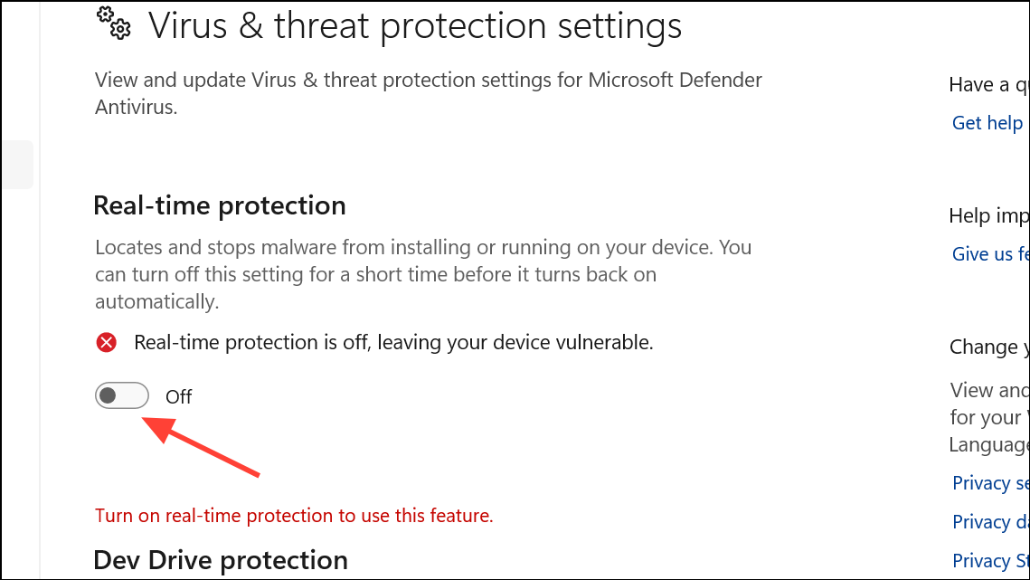 Step 3: Click "Manage settings" and toggle off "Real-time protection" if you have another antivirus program installed and running.