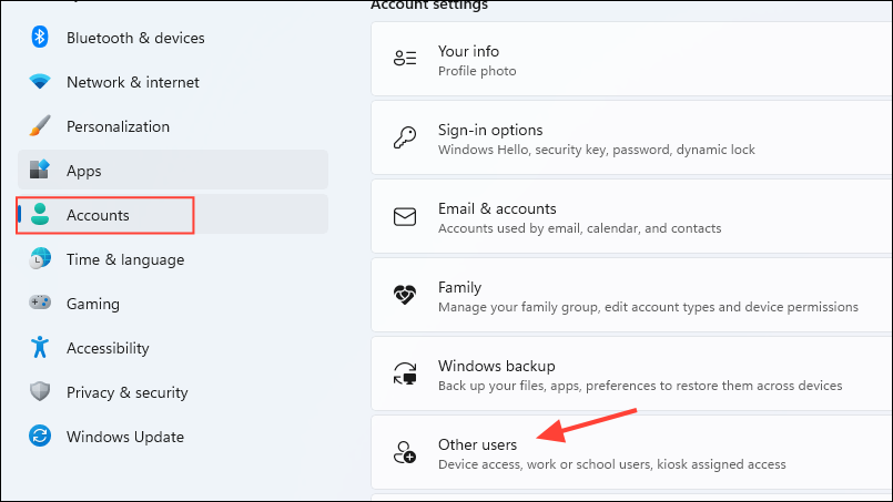 Step 4: Under Other users, select Add account or Add someone else to this PC.