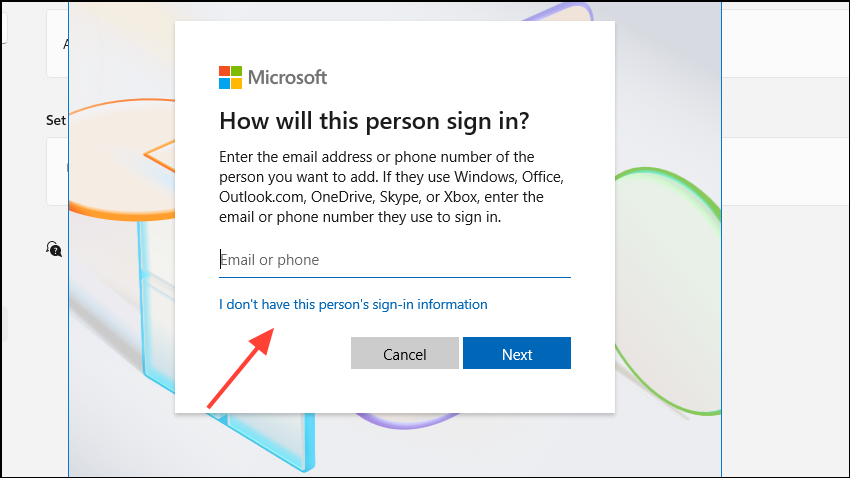 Step 5: Follow the prompts to create a new user. If you don’t have Microsoft account details, choose I don’t have this person’s sign-in information and then Add a user without a Microsoft account.