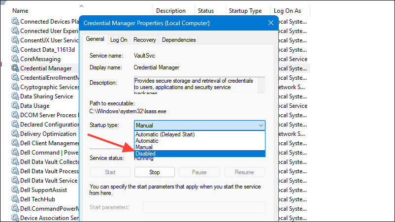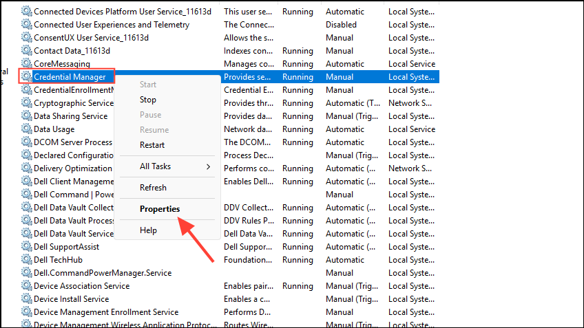 Step 2: Locate Credential Manager in the list, right-click it, and choose Properties.