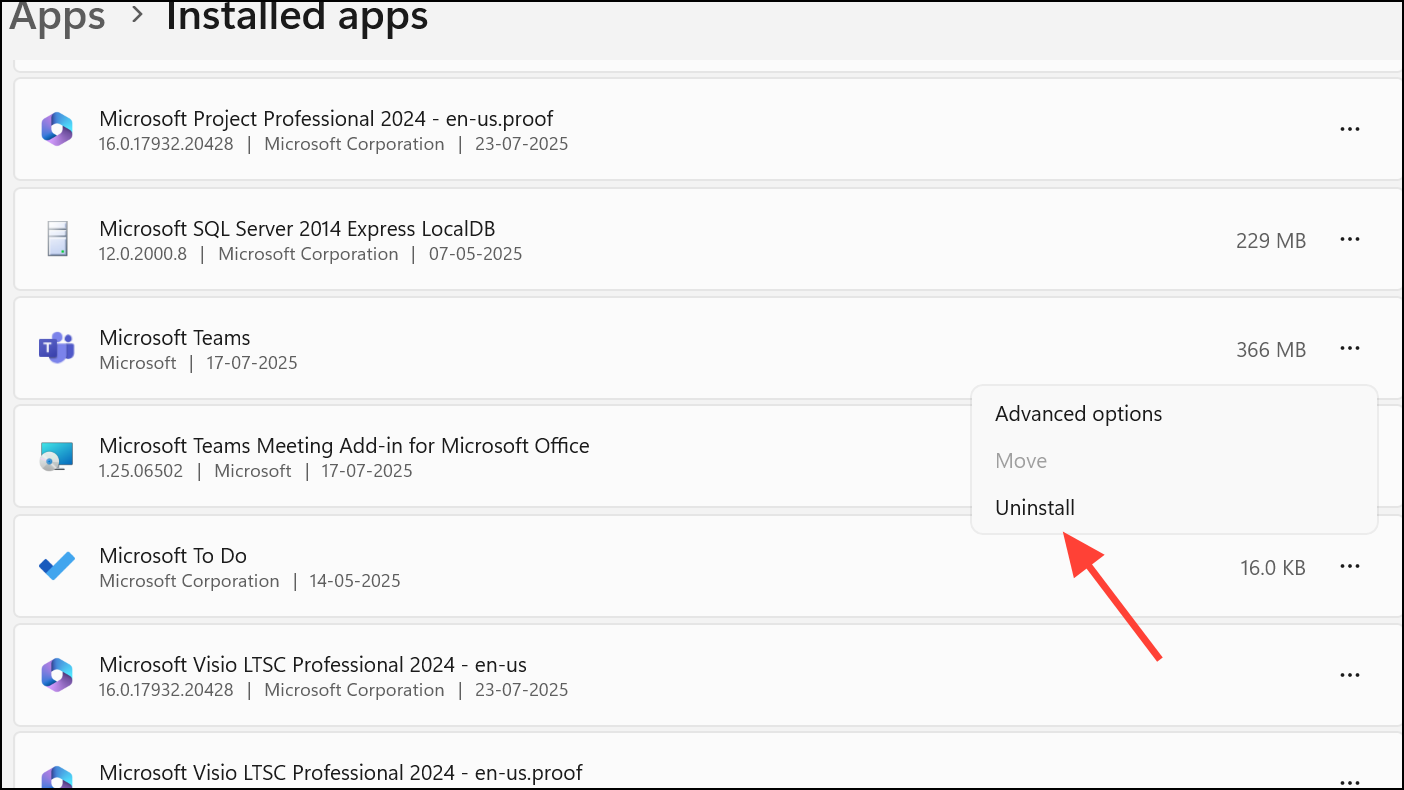Step 1: Uninstall Teams via Settings > Apps > Installed Apps. Remove both the Microsoft Teams app and the Teams Machine-Wide Installer if present.